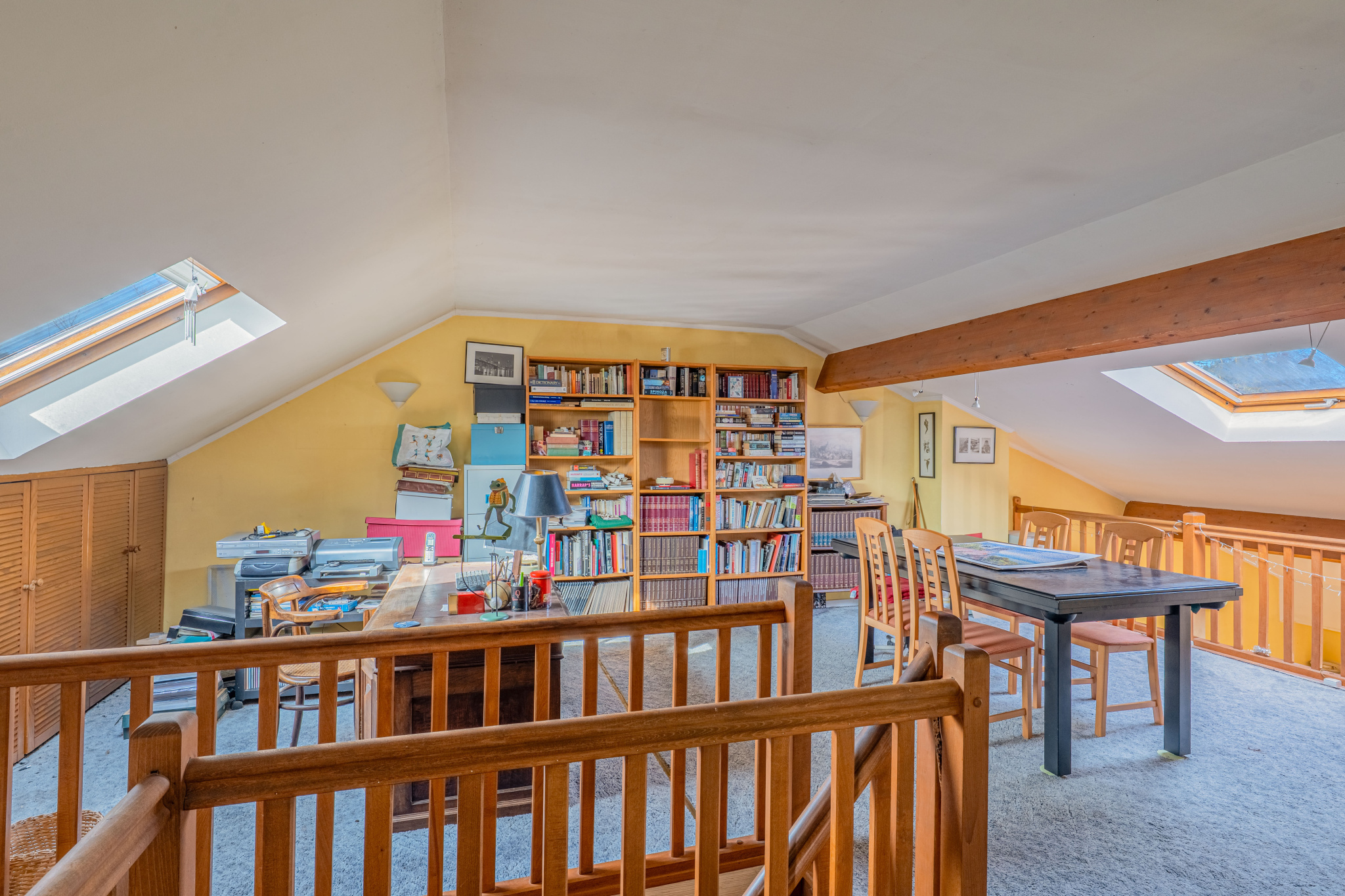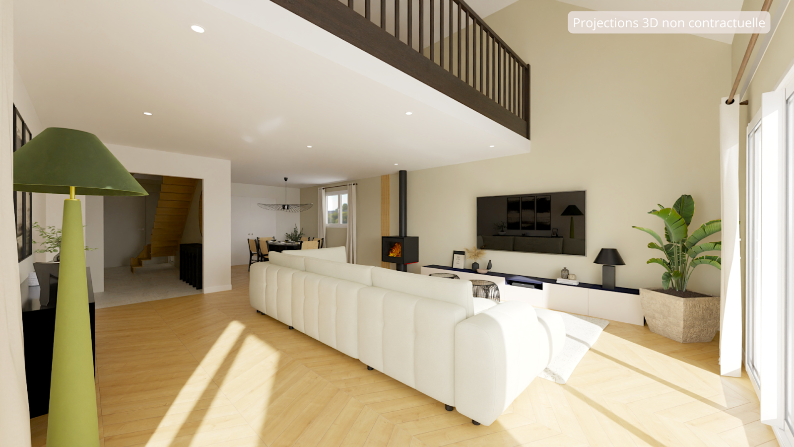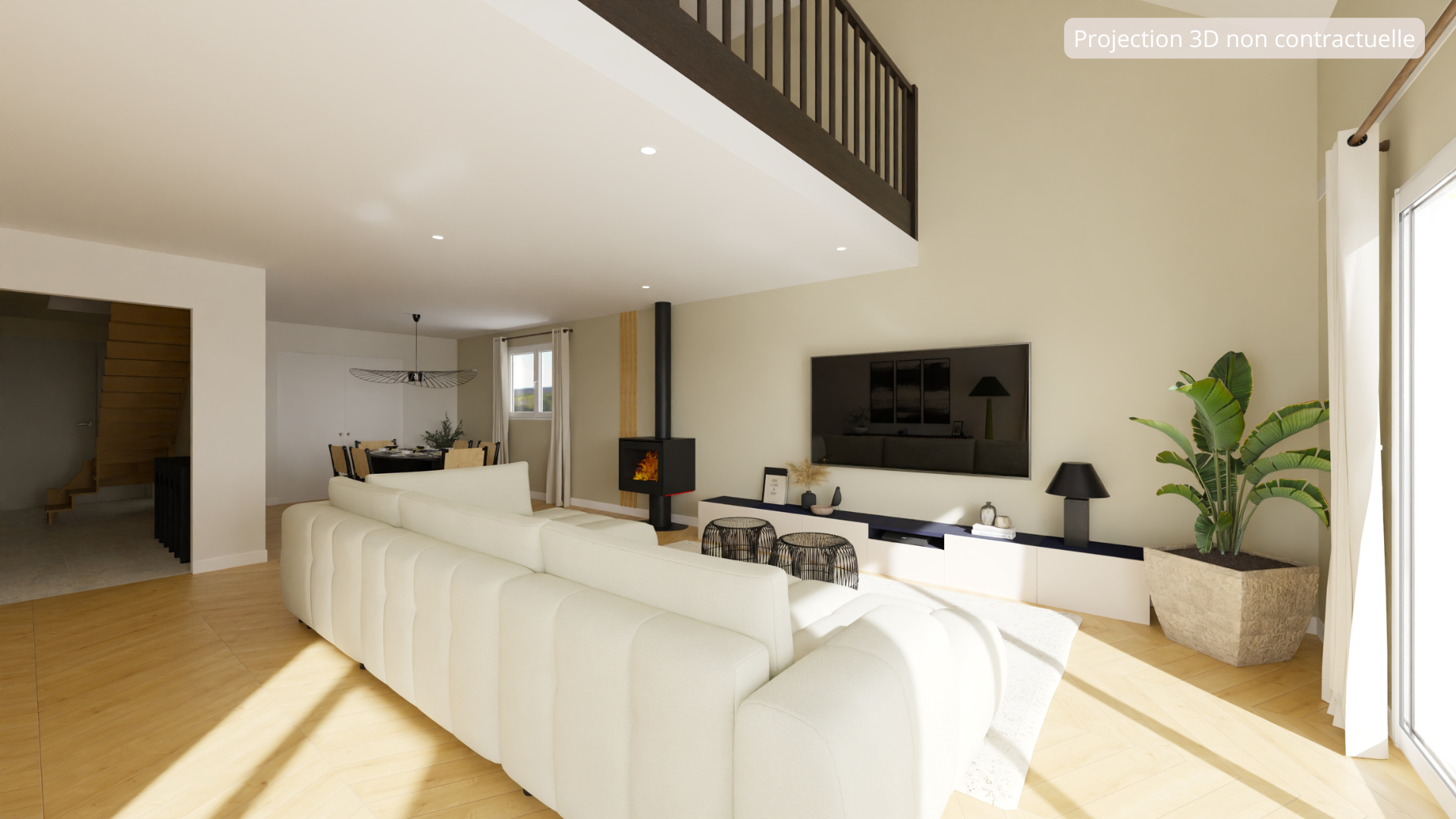 A l'étage, une mezzanine surplombant le séjour constitue un espace polyvalent, idéal pour un bureau, une salle de jeux ou une salle cinéma. Deux chambres supplémentaires ainsi qu'une salle d'eau avec WC viennent compléter l'ensemble.