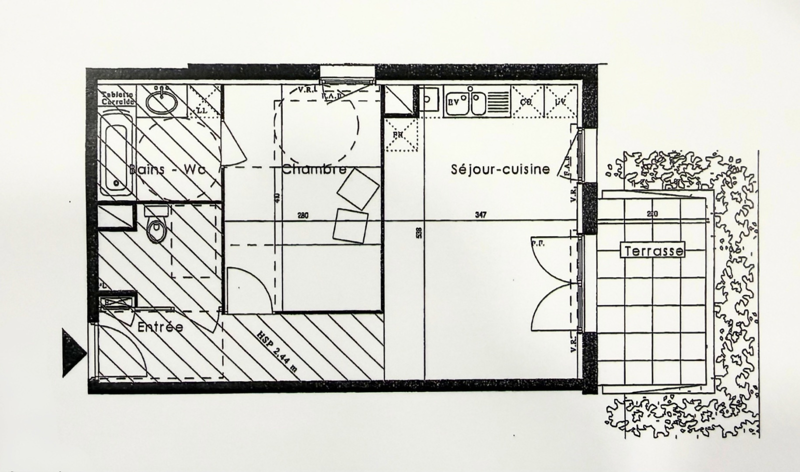 L’appartement se compose d’une entrée, d’un séjour avec cuisine ouverte donnant directement accès à la terrasse, d’une chambre avec salle de bains, ainsi qu'un WC/buanderie.